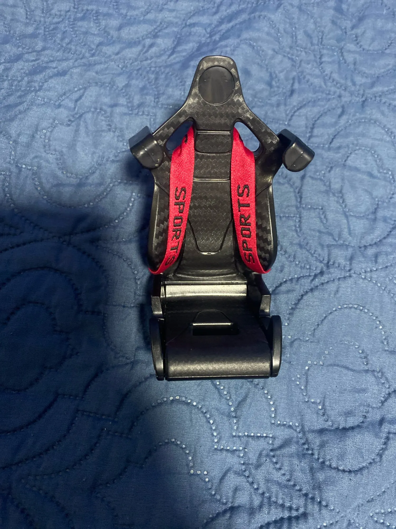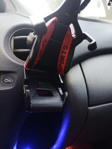 Unique air vent phone holder designed like a sport car seat. Made from durable polycarbonate, it securely holds your phone while driving.